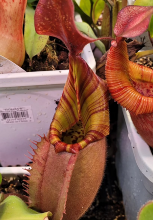 A robust hybrid from two squat, striped, and red veitchii specimens from the Bario area of Malaysia. Approximately 30 seed grown specimens were sold from this grex to growers around the world. Each speciment was assigned a number by the nursery. Most plants retain very red bodies, highly flared and striped peristomes, and squat to tall bodies.